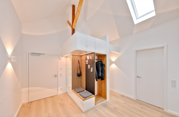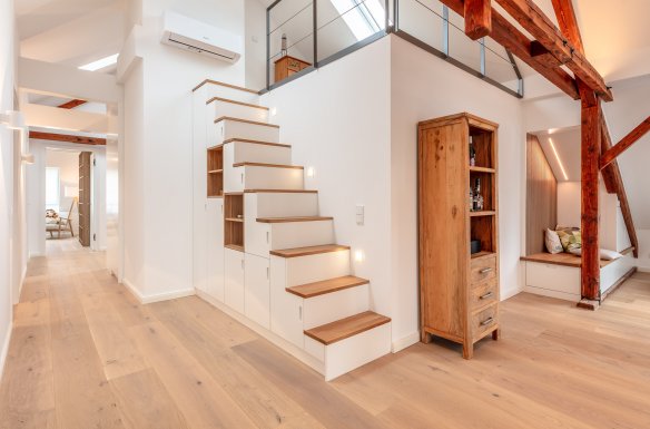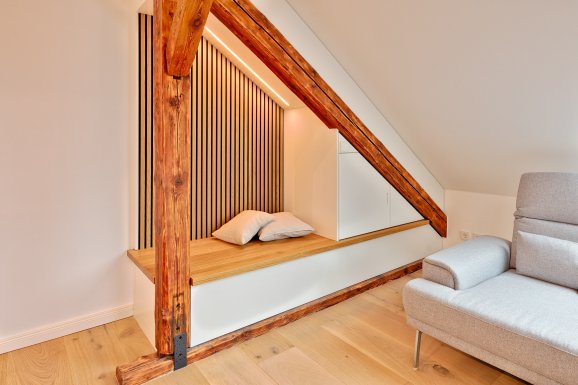 Intelligenter und individueller Möbelbau im Entree, ein Treppenmöbel und die Kuschelecke aus Tischlerhand runden den neu entstandenen Wohncharme ab.
