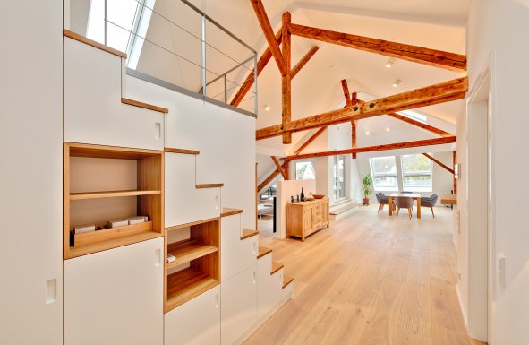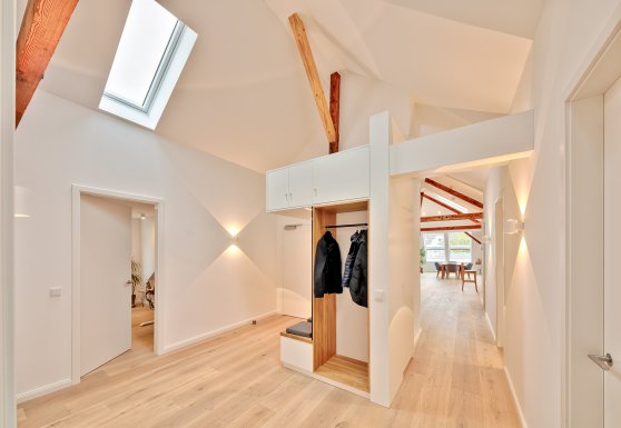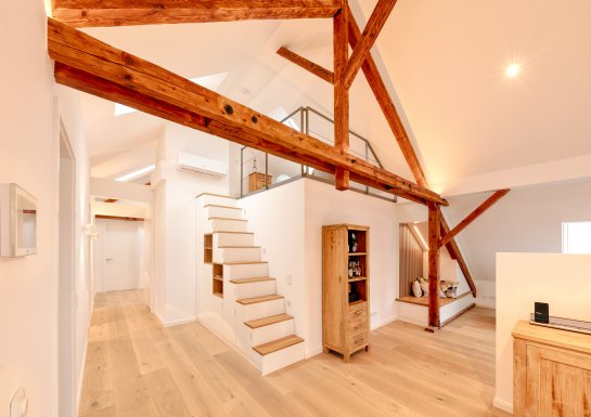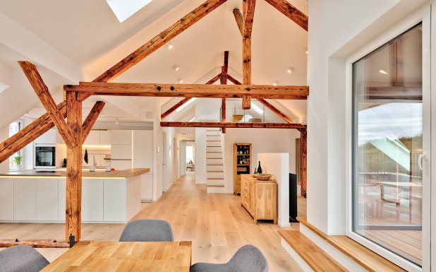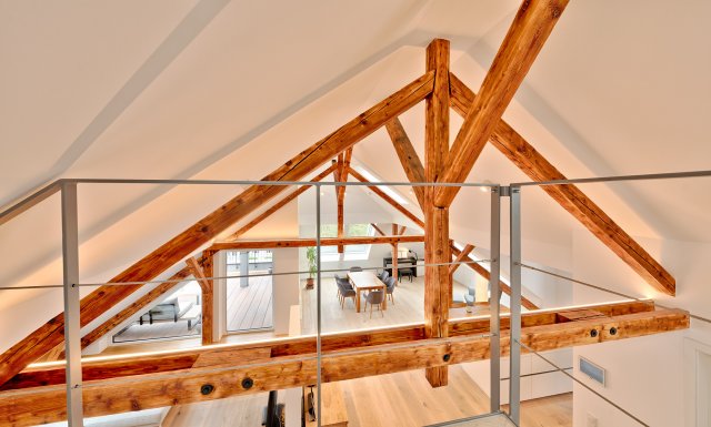 Die vorhandene Dachstatik wurde behutsam erhalten, das alte Tragwerk als wirksames Stilmittel genutzt, die Dachhaut bestens und förderfähig gedämmt und mit einer PV-Anlage mit Speicher genutzt.
