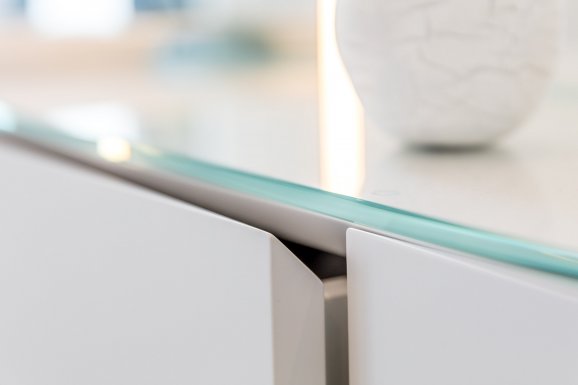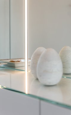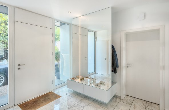 Bei diesem Entwurf einer Garderobenlösung wurde der Raum trotz Stellung des Einbaumöbels durch die großzügigen Spiegel für das Auge vergrößert. Eine direkte Belichtung über eine Linienleuchte flächenbündig integriert in der Spiegelebene macht dabei eine besonderen Reiz aus.