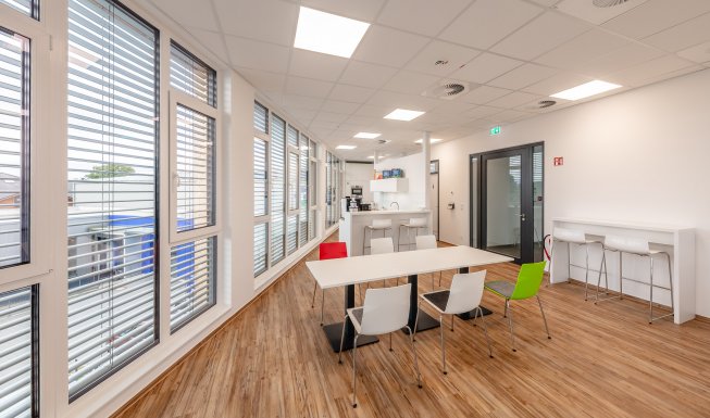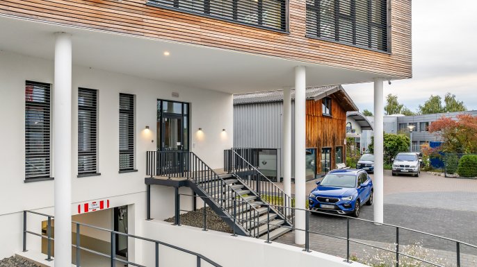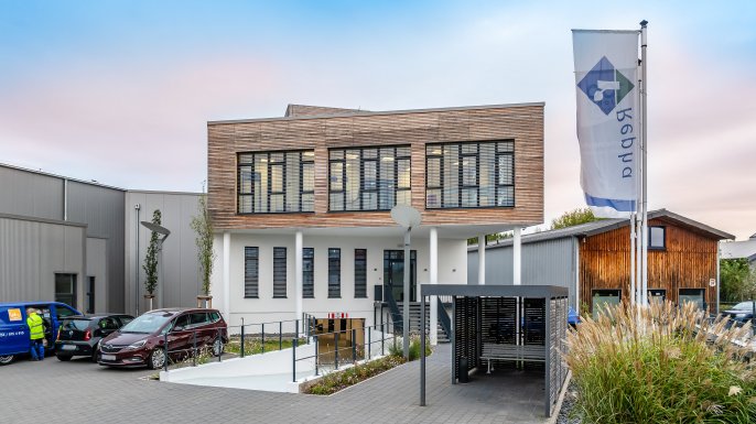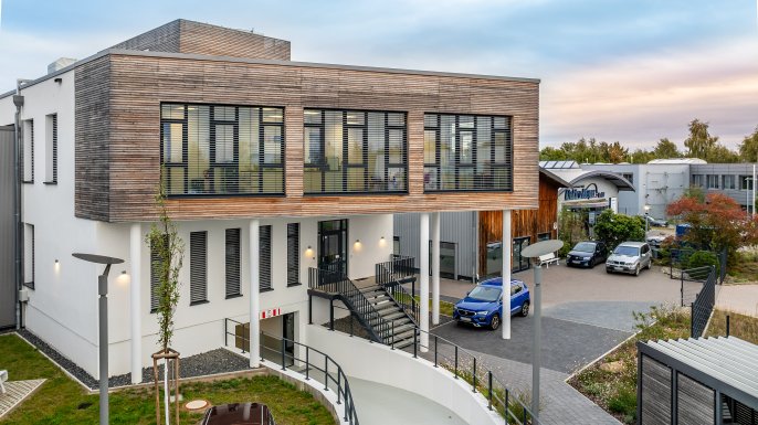 So wurde beim Neubau des Verwaltung- und Laborgebäudes schon in der Planung darauf achtgeben, welche Bauteile aus dem nachhaltigen Rohstoff Holz erstellt werden können und so konventionelle Bauweisen ersetzen. Es entstand ein Gebäudekonzept als Hybrid: